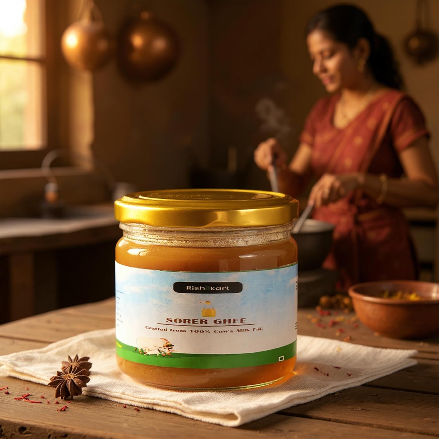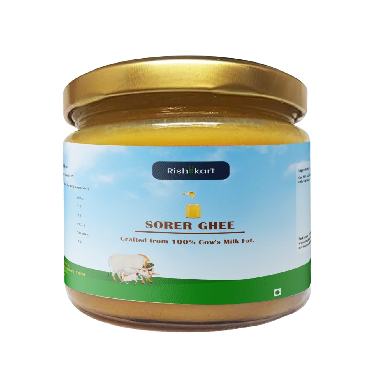 Bengal’s Cow Ghee is crafted from cream separated exclusively from traditionally reared cows by small-scale farmers. The cream is fermented with the addition of curd and then boiled over charcoal, adhering to age-old, traditional methods without the use of machines. This Cow Ghee is highly popular among consumers for its unique, pleasant aroma and flavor. No artificial ghee scent is used; the aroma is entirely natural. When spread on warm foods like rice, dal, khichdi, halwa, pulao, chapatti, and other Indian delicacies, the delightful aroma permeates the entire kitchen or dining area. Rishi Kart proudly offers the traditional and authentic “Sorer Ghee” directly from Nabadwip.