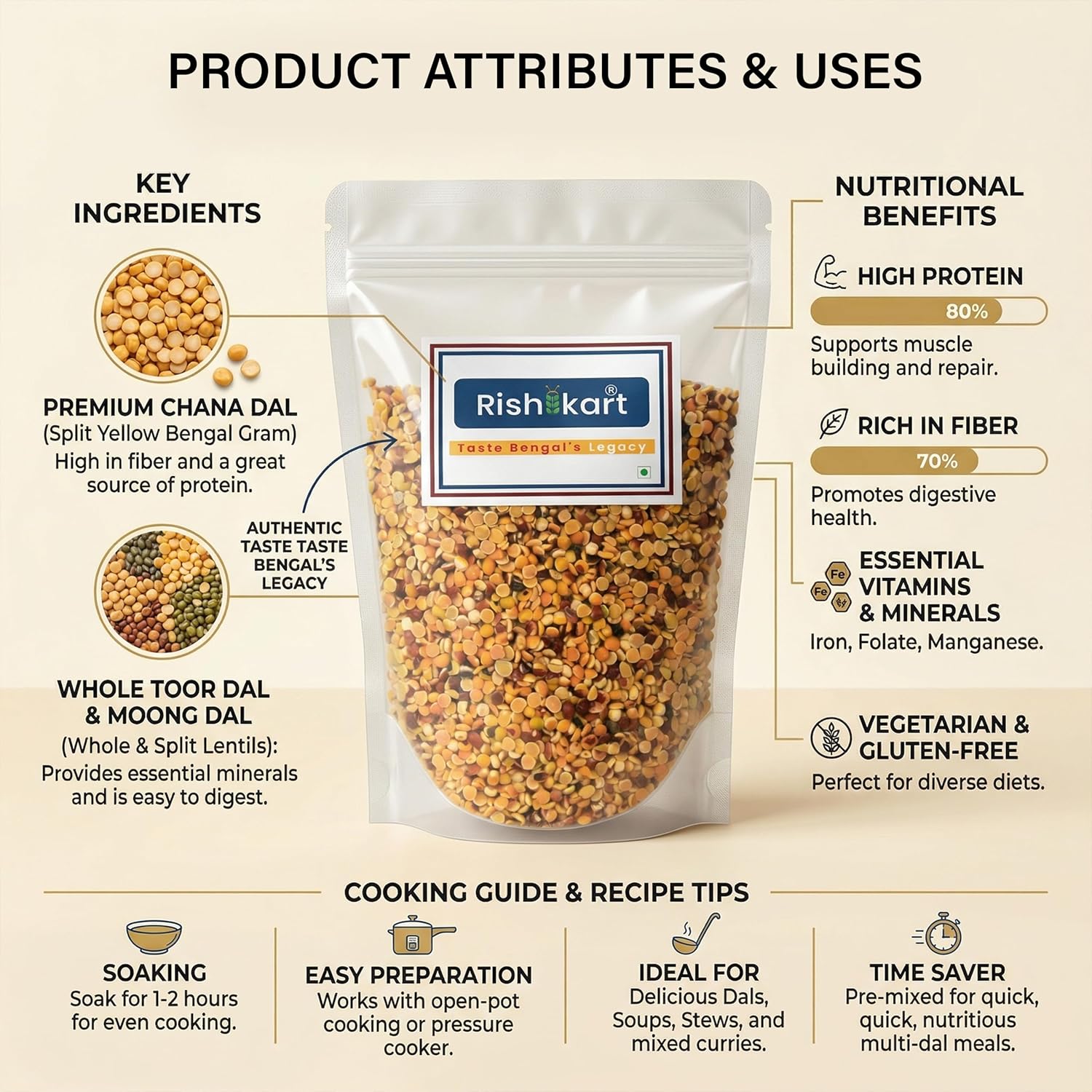 Discover the exquisite taste and nutritional goodness of Premium Bengal Sona Moong Dal. This superior quality split yellow lentil variety is sourced from the fertile fields of Bengal, known for producing some of India’s finest pulses. Each 450-gram pack contains carefully selected moong dal that cooks to perfection, offering a delightfully soft texture and subtle, nutty flavour that enhances any dish. Perfect for preparing traditional Indian dishes like dal, khichdi, or halwa, this versatile ingredient is rich in protein and essential nutrients. The dal’s pristine golden colour and uniform size speak to its premium quality. Store in a cool, dry place to maintain freshness. This convenient pack size is ideal for small families and regular cooking needs.