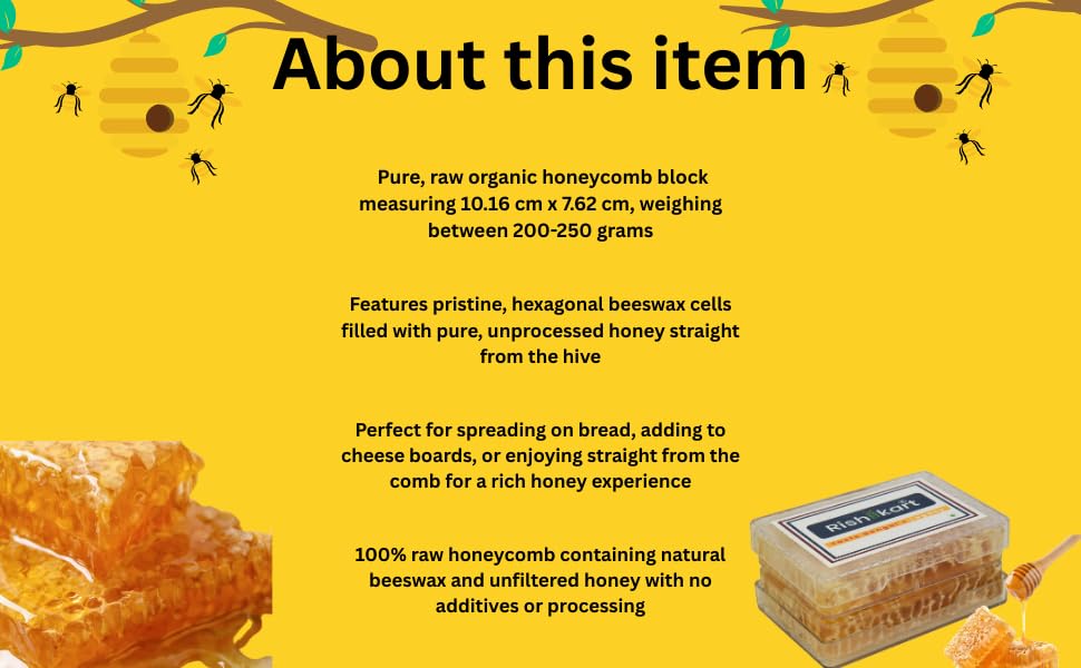 Experience the purest form of nature with the Rishi Kart Raw Organic Honeycomb, a meticulously harvested 4-inch by 3-inch block that brings the apiary directly to your table. Each 250-300g piece is a masterpiece of geometric precision, containing golden, liquid honey sealed within delicate, edible beeswax cells just as the bees intended. Because it is completely unfiltered and unprocessed, this honeycomb retains all its natural enzymes, pollen, and propolis, offering a complex floral flavor profile and a unique, chewy texture that processed honey simply cannot match. Perfect as a centerpiece for gourmet charcuterie boards, a decadent topping for Greek yogurt and warm waffles, or enjoyed straight as a wholesome energy boost, this organic honeycomb is a true testament to sustainable, artisanal harvesting.