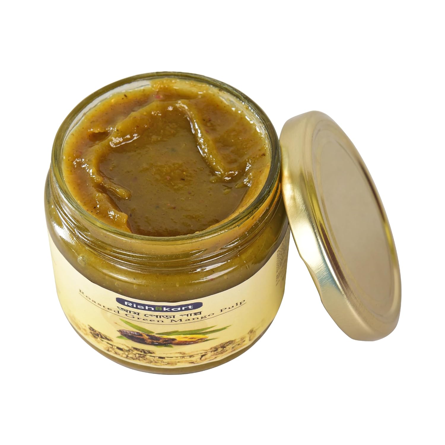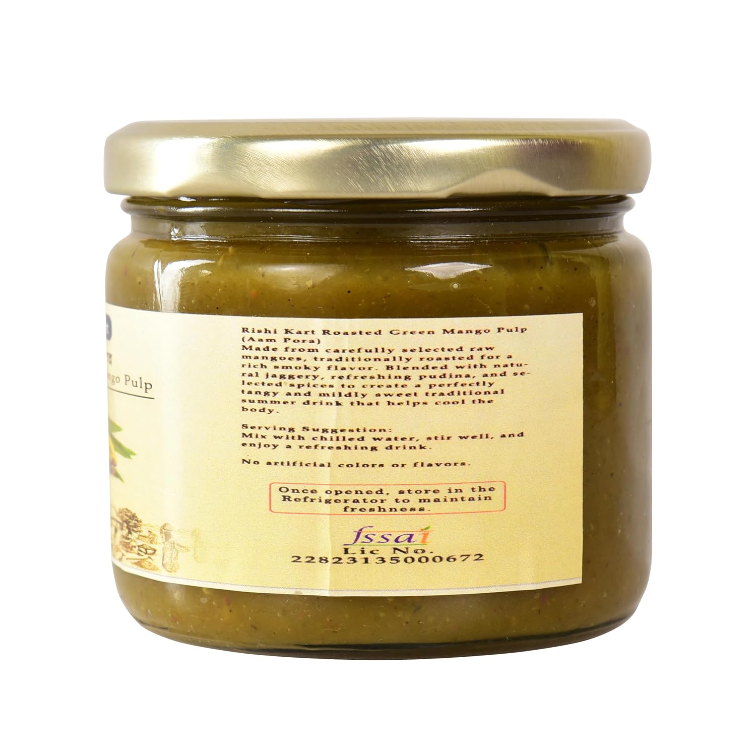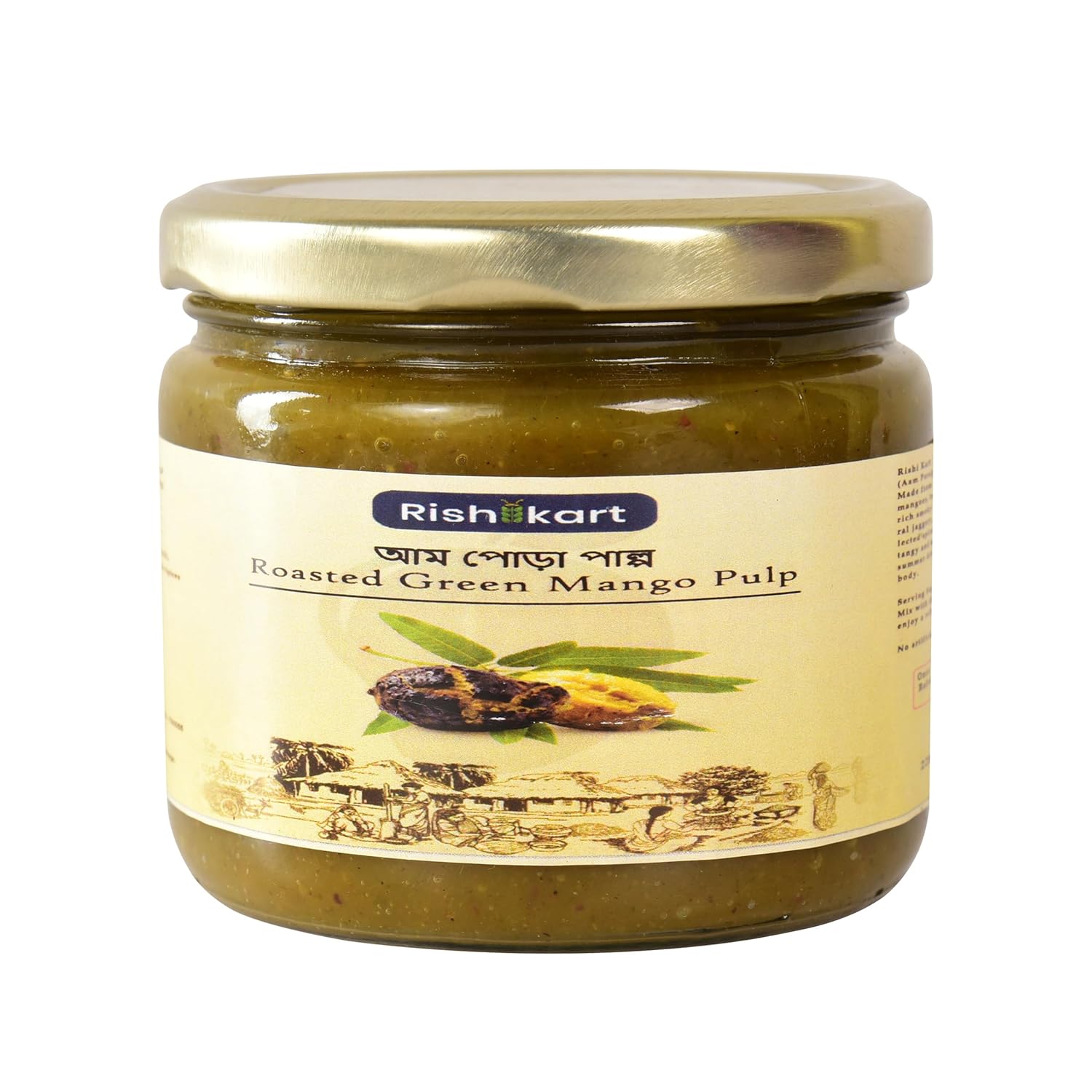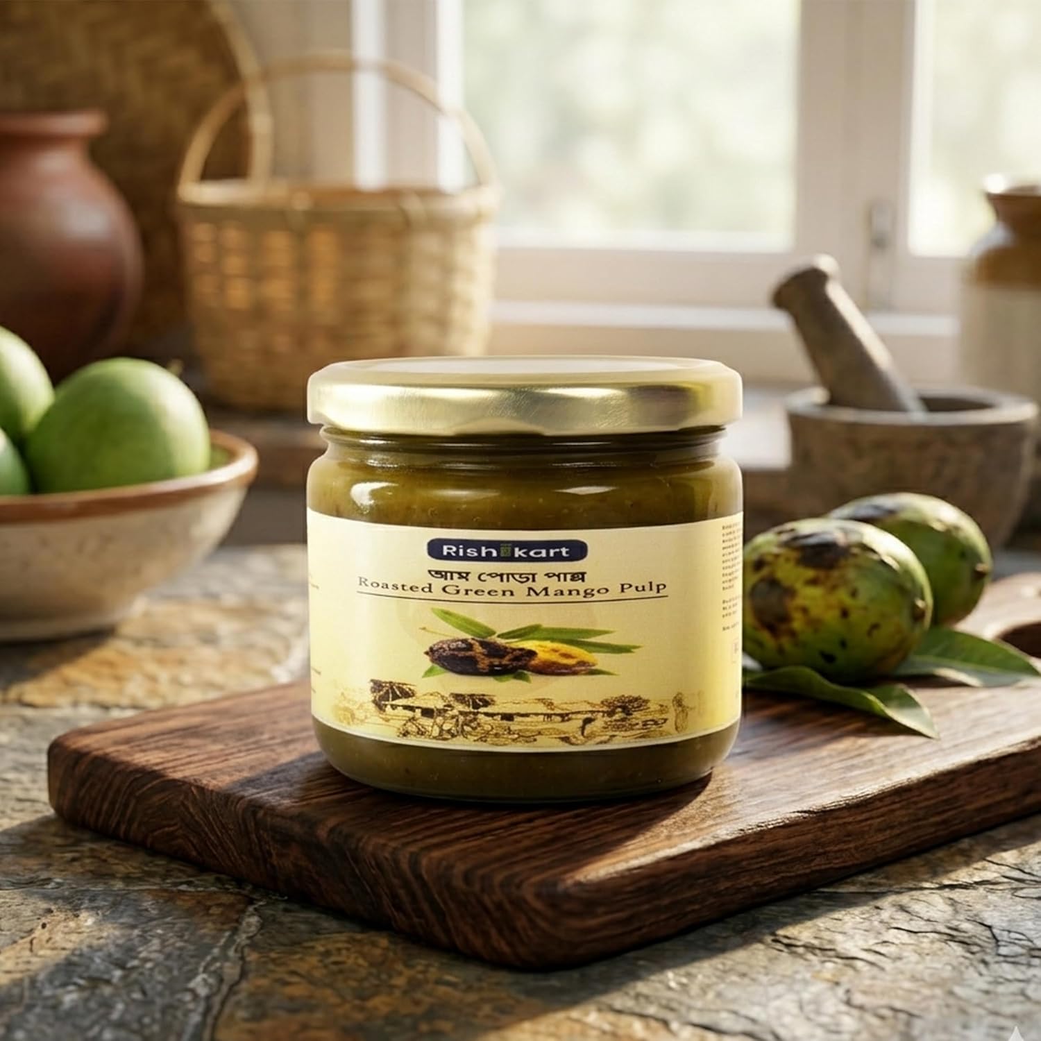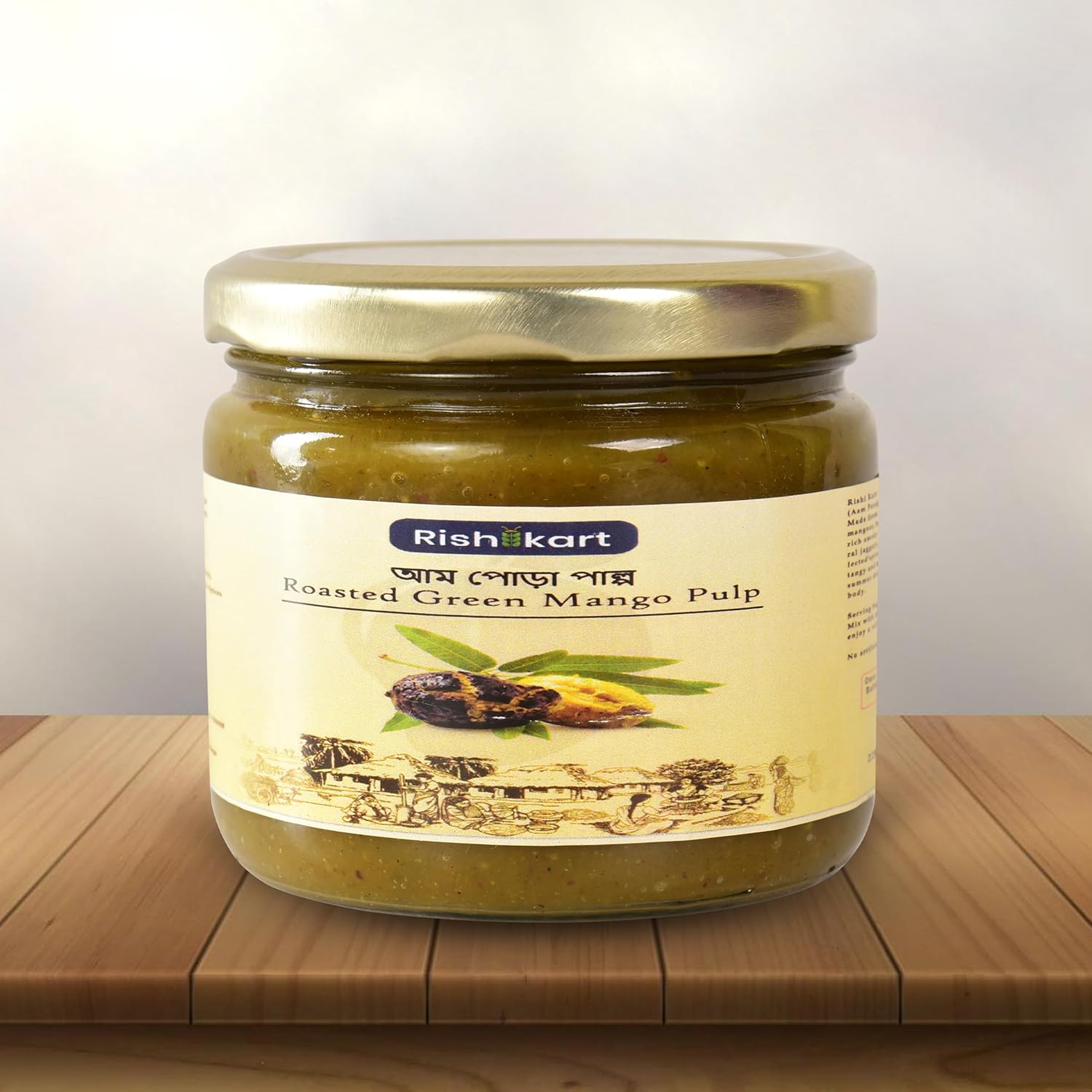 Beat the heat with the nostalgic taste of a traditional Bengali summer using Rishi Kart Green Mango Pulp (Aam Pora). This 400g jar offers a convenient, ready-to-use concentrate of roasted raw mangoes, meticulously prepared to capture that unmistakable smoky, tangy, and sweet flavor profile. By fire-roasting the Kaccha Aam in the authentic style, we’ve preserved the deep, charred aroma that makes this refreshing drink a cooling sanctuary during soaring temperatures. Simply mix a spoonful with chilled water and a pinch of black salt to recreate the legendary Aam Pora Shorbot in seconds. Completely natural and free from artificial fillers, this pulp provides an authentic, vitamin-rich refreshment that brings the wholesome, revitalizing traditions of an Indian household straight to your glass.